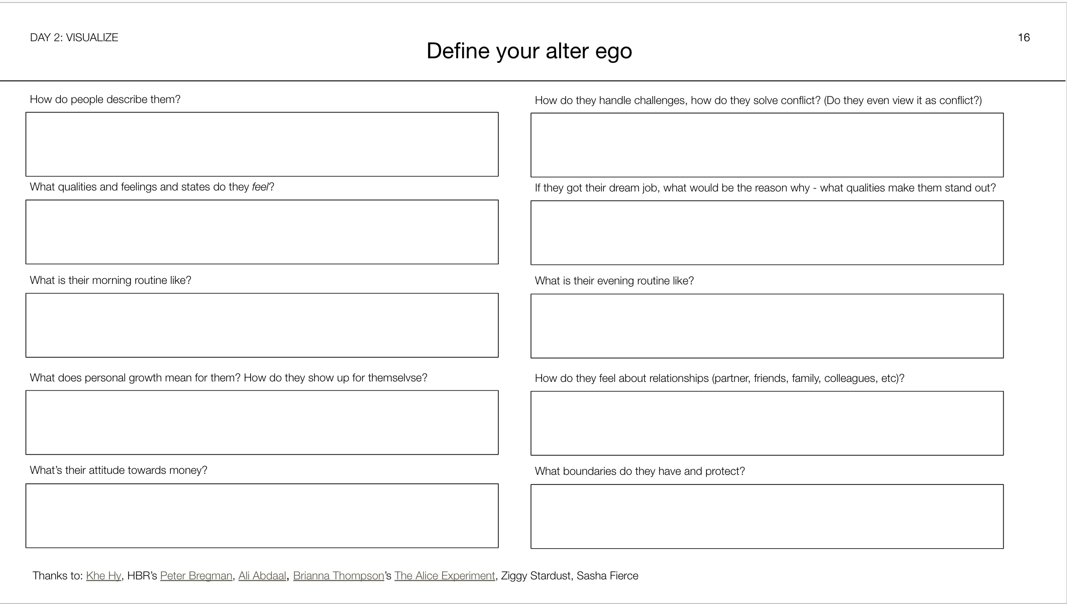 I mentioned in my previous writing the high-level idea of identities, but this exercise seems to aggregate the concept into one idealized version of yourself with a page committed to your alter ego. Take all of your identities of what you aspire to be and put them in front of you in a single place.