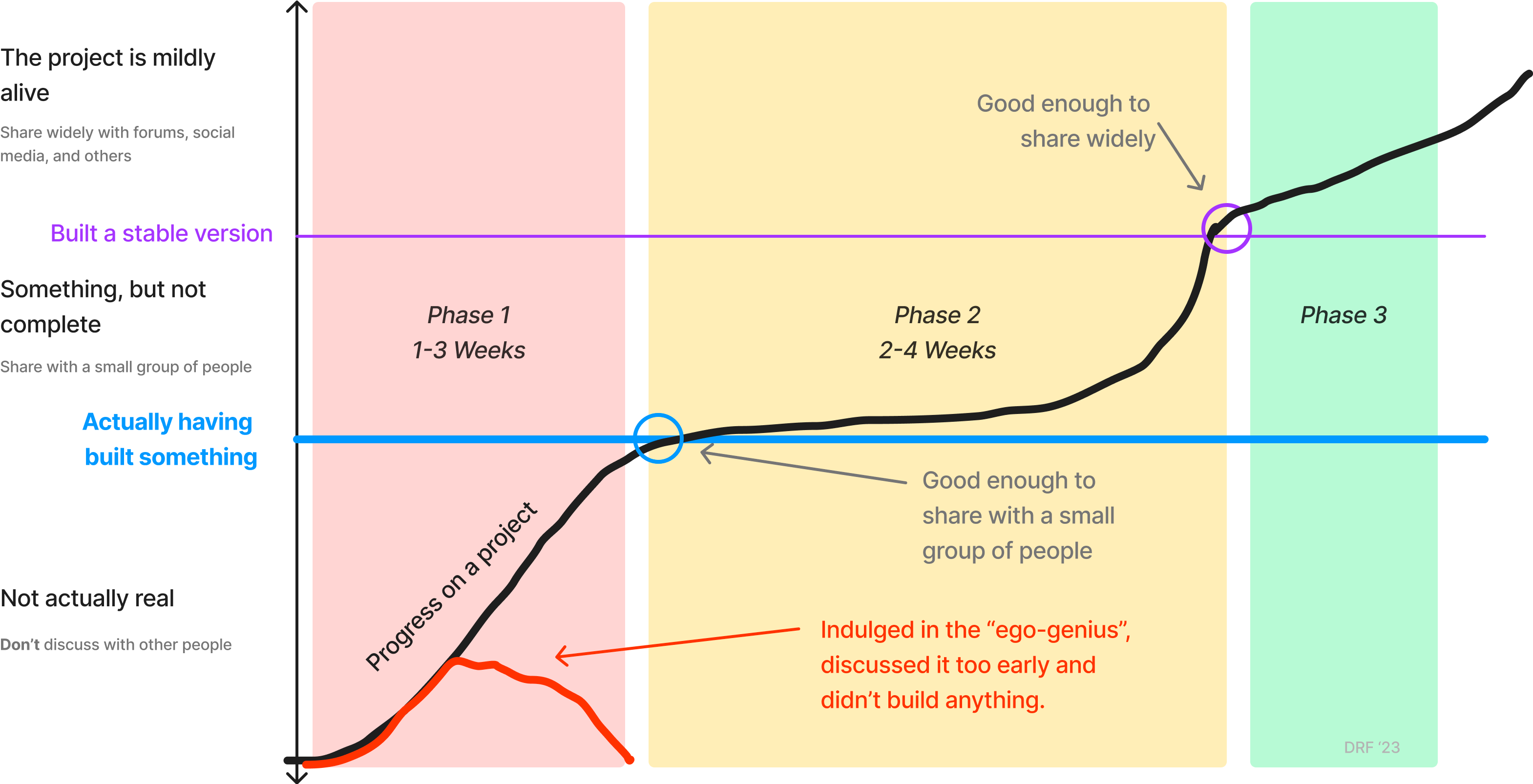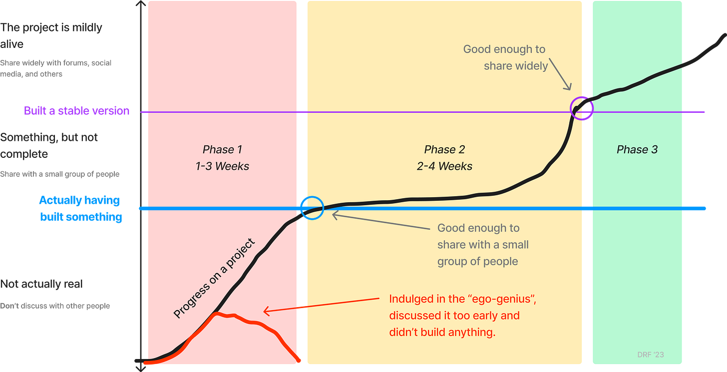 Choosing when to talk about a project during its early stages is super important. You might not think it matters much in the beginning, but I've learned that fighting the internal battle between ego, quality, and validation is key to making a project successful. Let’s explore each of these phases to see how we can get more of our personal projects done.